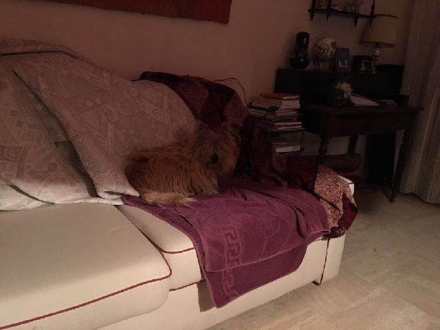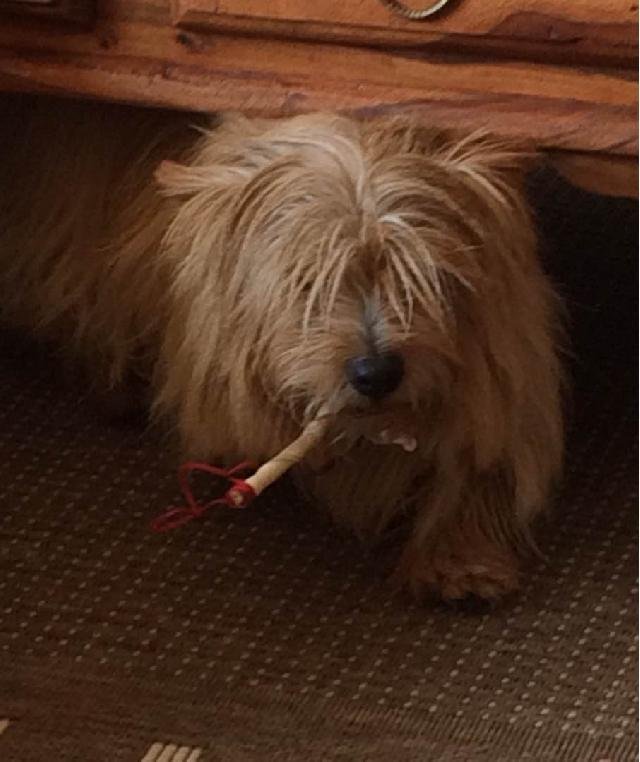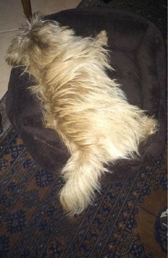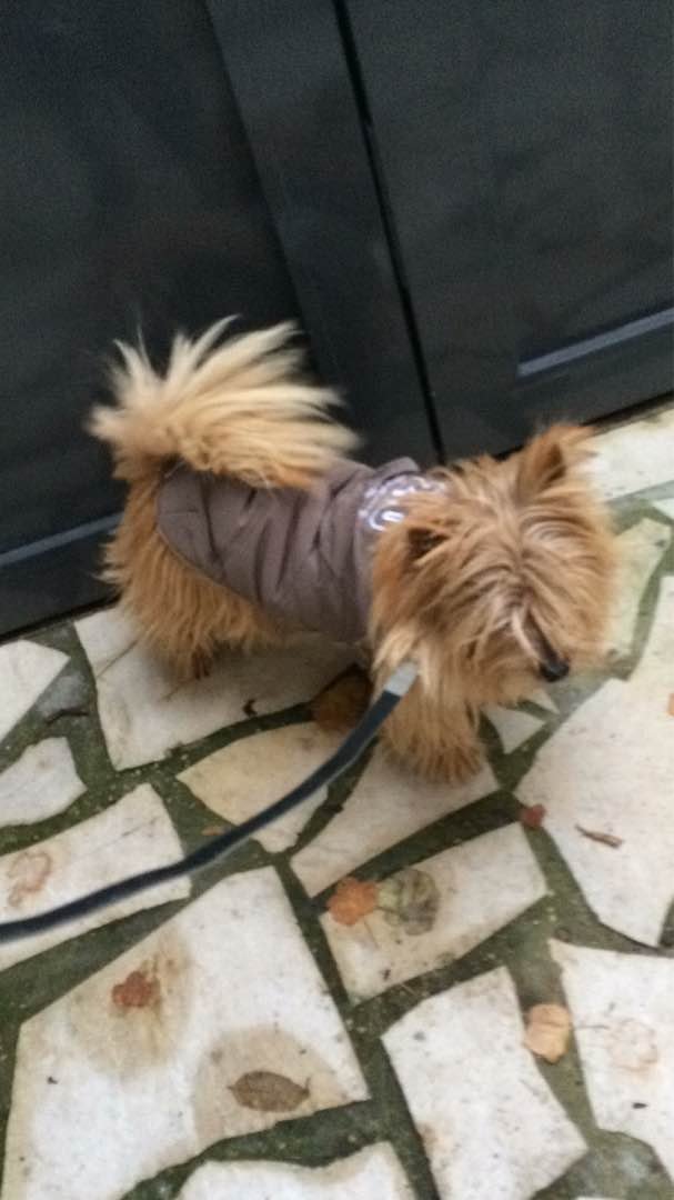 J’ai un norwich terrier, Enzyme, de 8 ans. Elle est aveugle donc il est difficile de lui apprendre des choses, cependant je consacre toutes mes matinées à la brosser, la promener, lui couper les poils, lui parler et la câliner.